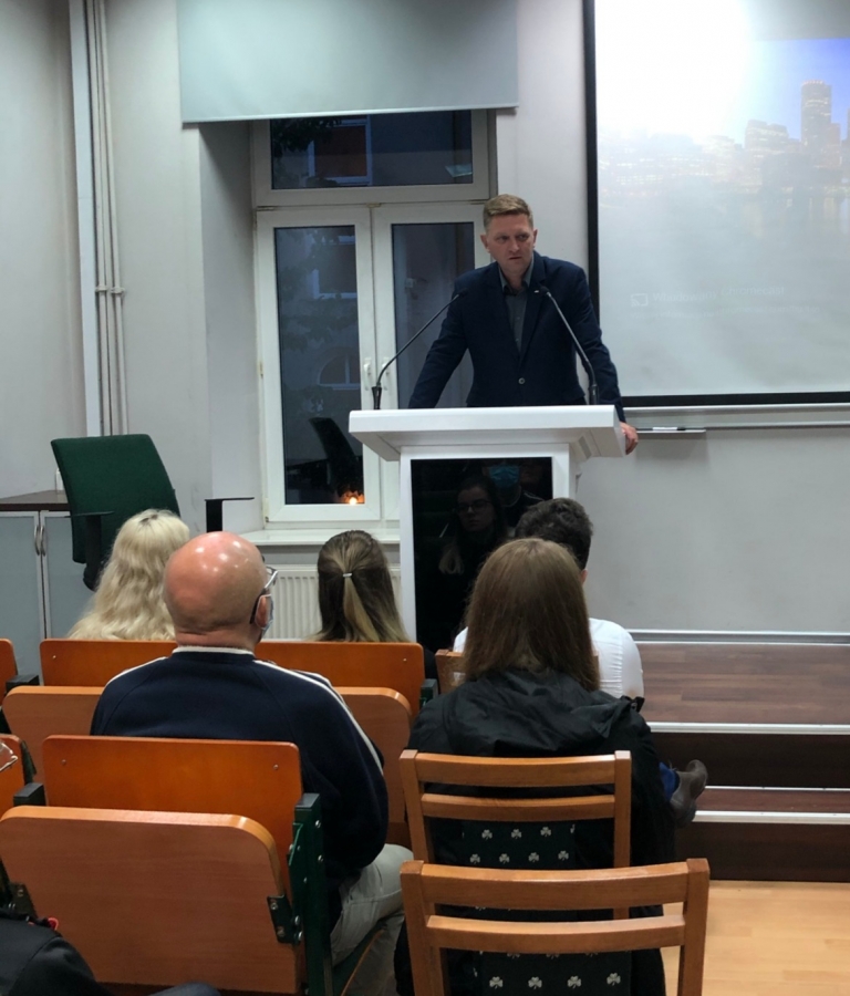 Projekcja filmu Uczestnicy spotkaniaUczestnicy spotkaniaPoseł RP Andrzej RozenekUczestnicy spotkania i Poseł RP Andrzej RozenekUczestnicy spotkaniaJeden z uczestników spotkania podczas dyskusjiPoseł RP Andrzej Rozenek i lider Wiosny Patryk FajdekUczestnicy spotkania